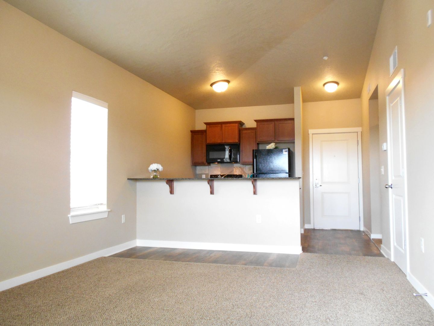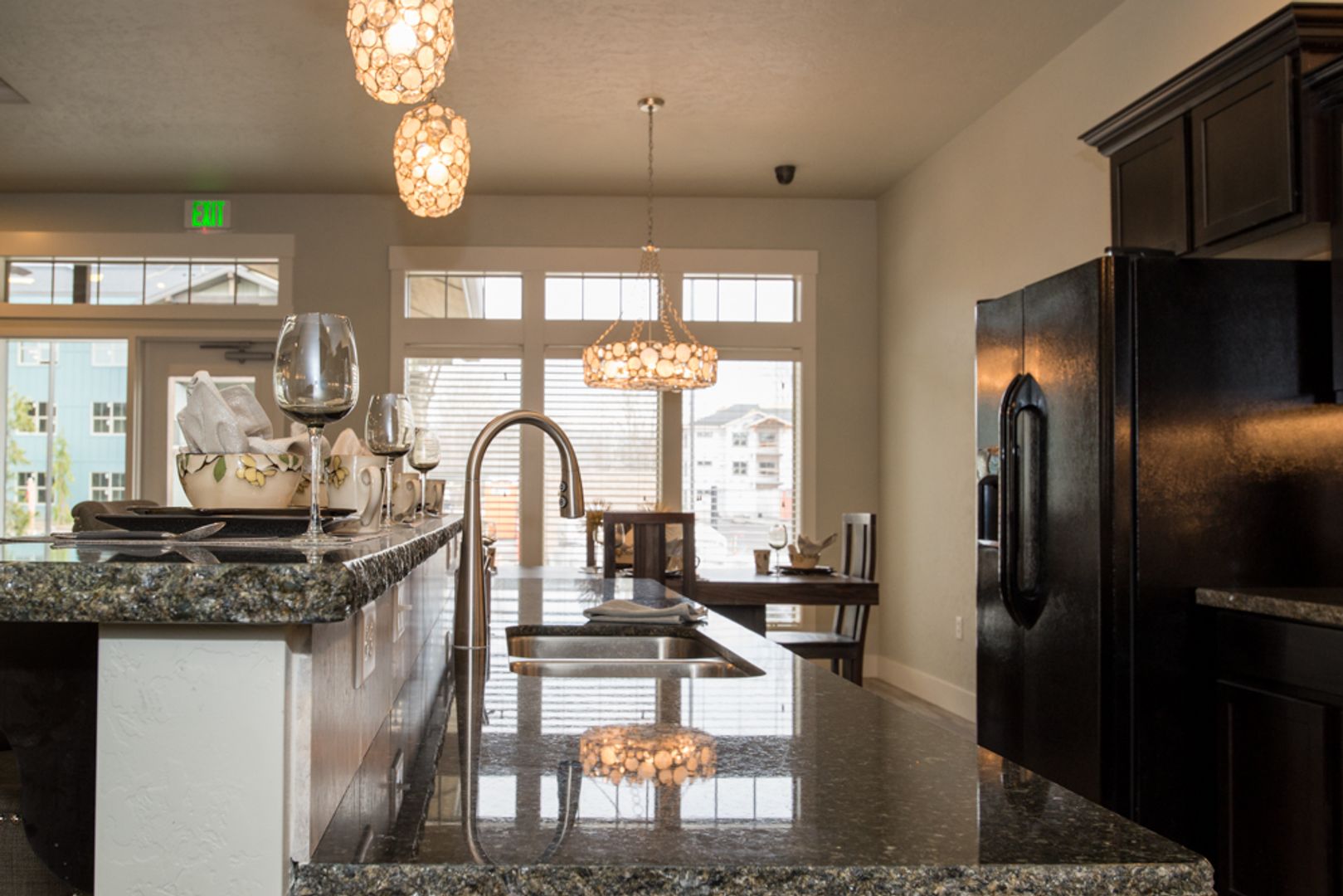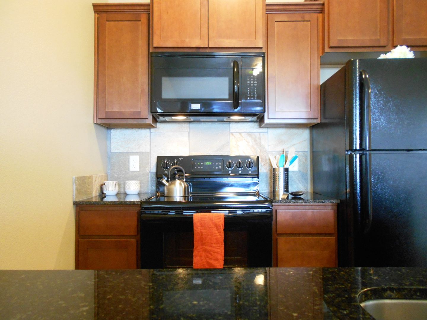 Our custom interiors include granite rough edge countertops, stainless steel in-set sink, retractable kitchen faucet, custom cabinetry, carpet with 8lb pad, warm interior paint, large windows with natural light, black on black appliances with flattop cook range, icemaker, front Loading washer/ dryer, private patio or balcony with storage, and an abundance of closet space.